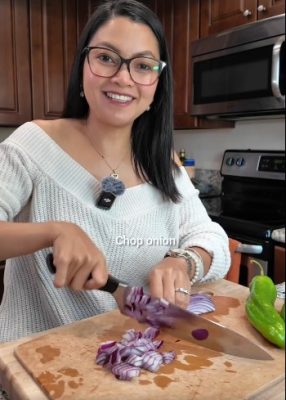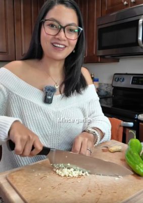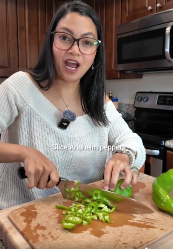 Mince garlic, chop onion, and slice Anaheim peppers.