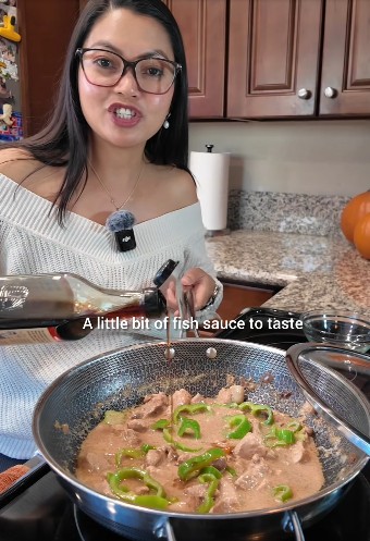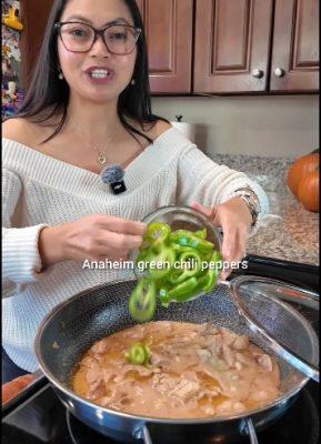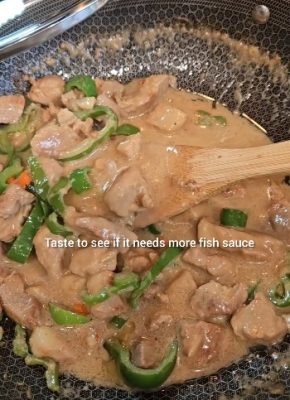 Add the Anaheim green chili peppers and a splash of fish sauce. Stir and cook for a few minutes. Taste and adjust the fish sauce as needed. Once everything is to your liking, it’s ready to serve.